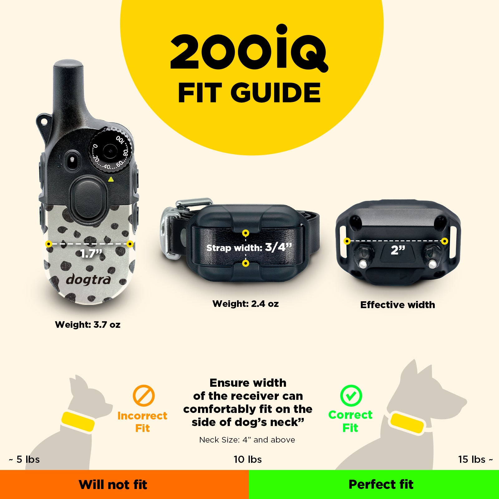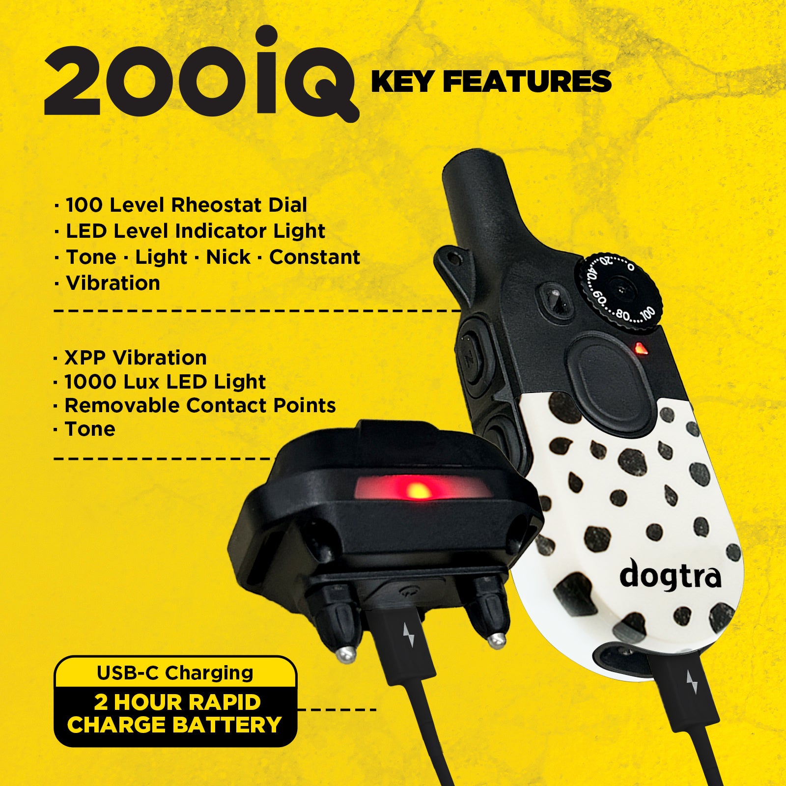 Meet your everyday training partner. The 200iQ e-collar makes dog training simple and stress-free. Easy-to-hold and control remote with 100 levels, tone, and vibration creates clear communication with your dog. Remove contacts for vibration-only training. Waterproof d...More Details