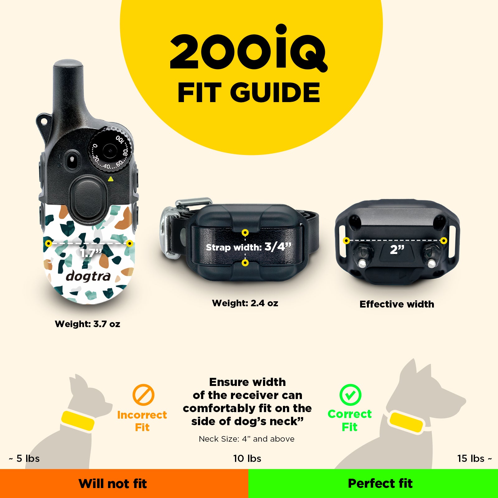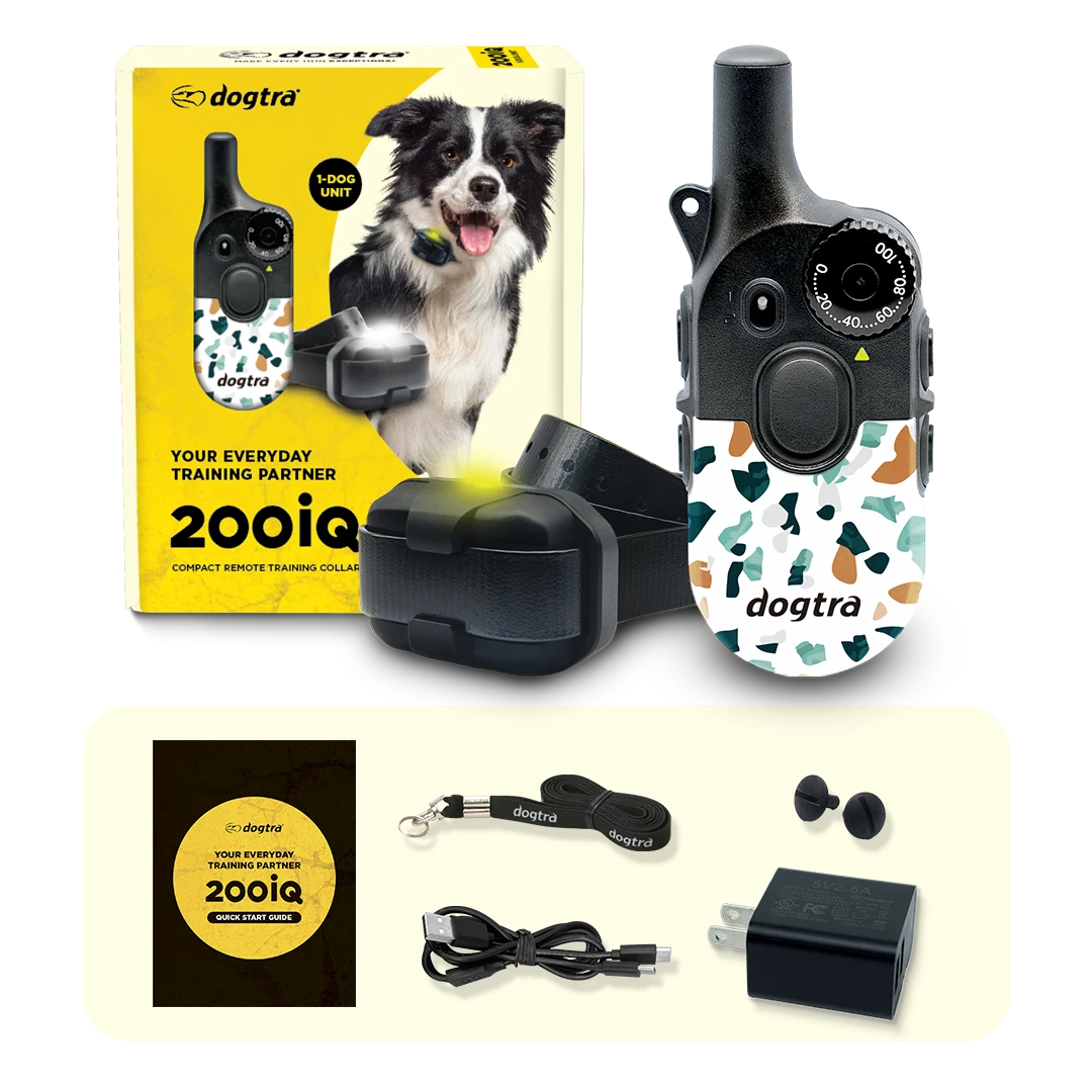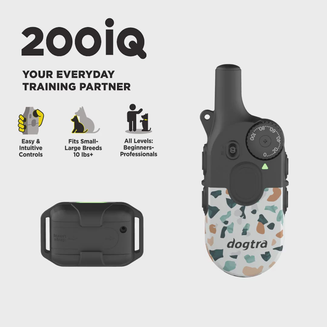 Meet your everyday training partner. The 200iQ e-collar makes dog training simple and stress-free. Easy-to-hold and control remote with 100 levels, tone, and vibration creates clear communication with your dog. Remove contacts for vibration-only training. Waterproof design handles daily walks to weekend adventures. Compact and lightweight versatile for small, medium and large breed dogs.