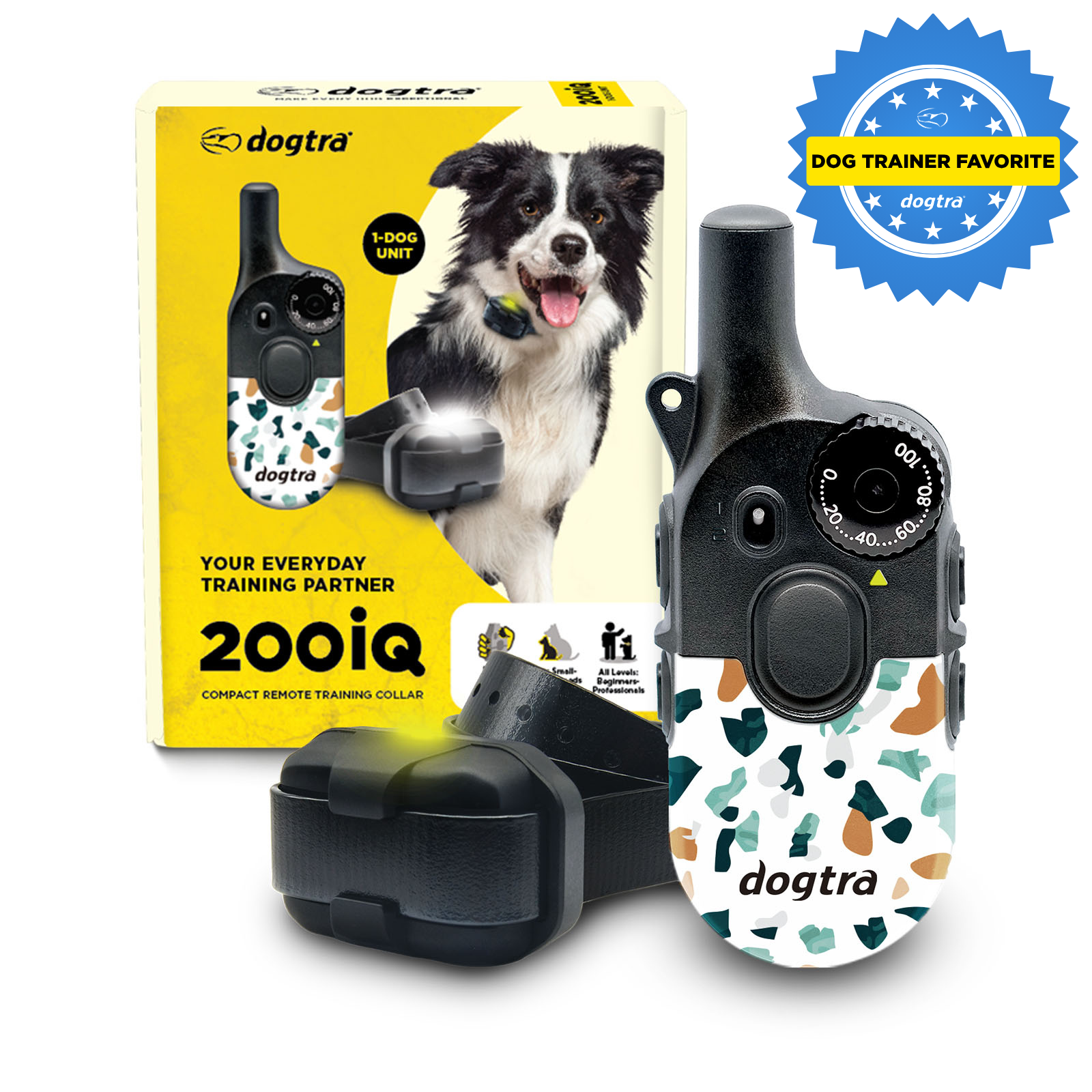 Meet your everyday training partner. The 200iQ e-collar makes dog training simple and stress-free. Easy-to-hold and control remote with 100 levels, tone, and vibration creates clear communication with your dog. Remove contacts for vibration-only training. Waterproof d...More Details